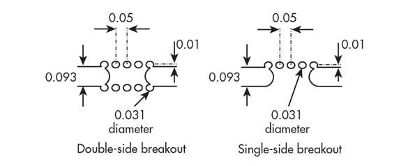五孔穿孔圖案是可分離凸耳的標準配置。在限制走線或組件邊緣間隙以及必須將凸片放置在懸垂零件下方的情況下,可以使用用于孔口的三孔圖案。三孔突圍要弱得多,與五孔突圍的間距必須更近。