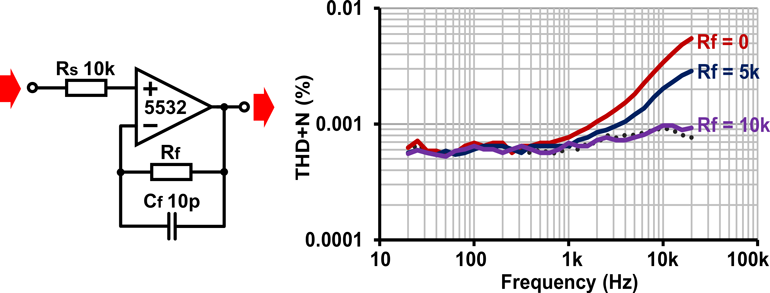 7.源電阻為10kΩNE5532緩沖器表現(xiàn)出共模失真。Rf = Rs時,將對此進行補償。虛線是測量平臺;在所有情況下均為20 dBu輸入。