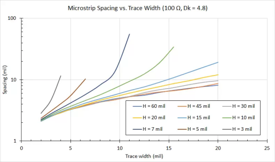 圖 1. 間距和寬度值對將在不同厚度的 Dk = 4.8基板上提供100歐姆的差分阻抗。