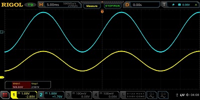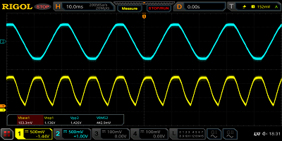 我們可以用示波器來顯示。我正在使用一些非常便宜的大容量電阻器,這些電阻器在分壓器的中央無法給我提供1.65V的電壓。藍(lán)色是2V峰峰值信號,黃色是具有DC偏移的信號。
