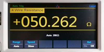 我使用4線電阻測量來測量加熱元件。在讓我的萬用表將讀數(shù)平均一段時(shí)間后,它穩(wěn)定在50.262歐姆。